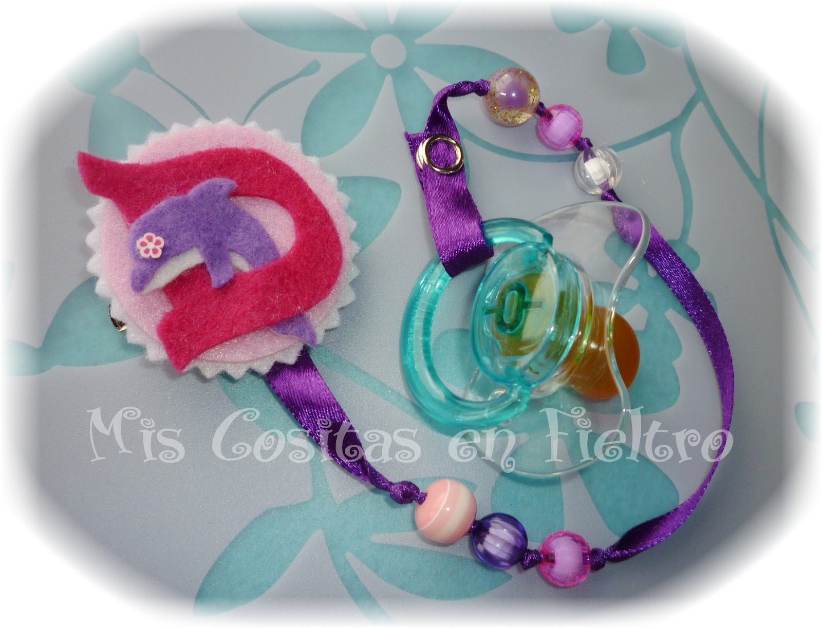 Ayer estaba a punto de marchar a la oficina de correos con un paquete cuando se me ocurrió añadir un pequeño extra. Varias personas me comentaron si no me animaba a hacer algún tipo de chupetero, así que aproveché la ocasión para regalar -sí, este primero va de regalo- a la pequeña Daniella un lindo chupetero personalizado. Basándome en mis diseños de los rótulos con animales he hecho esta primera pieza. Sobre una base rosa y blanca al estilo camaféo va la D de Daniella. Desde su interior asoma un lindo delfín en lila y blanco decorado con una linda florecilla de fimo a modo de ojo. En lugar de la típica cadenita plástica, chupete y prendedor se comunican por un lazo de raso violeta decorado con diversas cuentas acrílicas en los colores de la composición. Por el lado del chupete el lazo se ajusta con sistema de corchete de presión (ojo: chupete no incluido). No sabía qué tipo de broche poner a la base. En ocasiones las pinzas se sueltan, así que el estilo alfiler es más seguro, pero a veces no tenemos tiempo de pararnos a colocar (o simplemente le toca a papá vestirle, y ya sabemos que la mayoría,... bueno... ¡¡ya me entendéis!!). Ante la duda, aprovecho para estrenar el tipo de broche mixto: lleva imperdible y además una pinza dentada para elegir con comodidad el sistema de enganche.