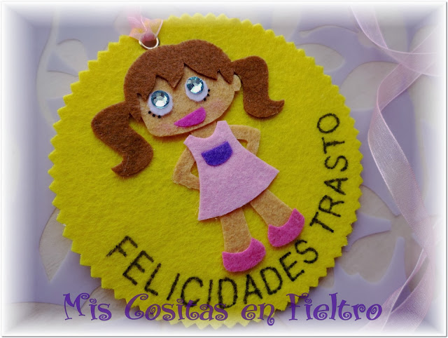 La dulce Edurne el año pasado recibió un regalito de sus padres que aún no os había mostrado. Si no recuerdo mal fue por la culminación exitosa del curso escolar. Se trata de una gran medalla de fieltro con cinta de organza para poner alrededor del cuello. Representa a una niña con cara de pillina con la que Edurne se identificó perfectamente. Un mensaje personal felicita a la pequeña por la parte de alante.